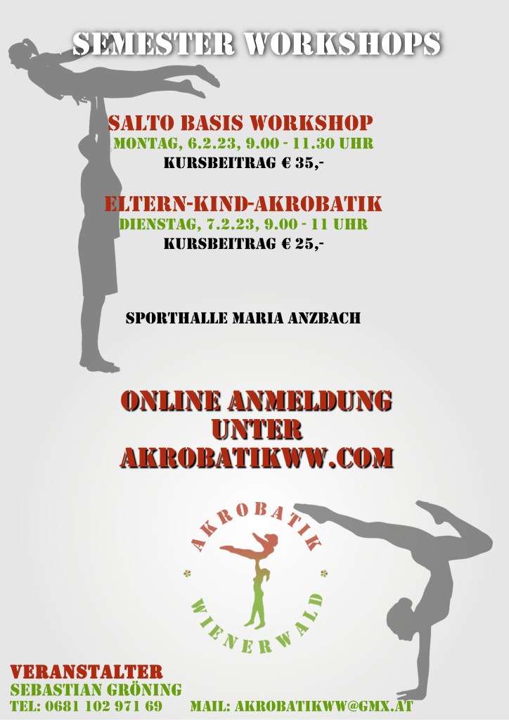 Ansonsten starteten wir diese Woche mit der Outdoor Akrobatik; etwas verspätet dank meiner Fußverletzung, aber doch. Wir werden jetzt voraussichtlich noch bis Ende Oktober draußen arbeiten, danach geht es hier in die Winterpause. Derzeit sind die geplanten Termine – in Abhängigkeit des Wetters – montags 16.00 – 16.50 Uhr und mittwochs 16.30 – 17:20 Uhr.